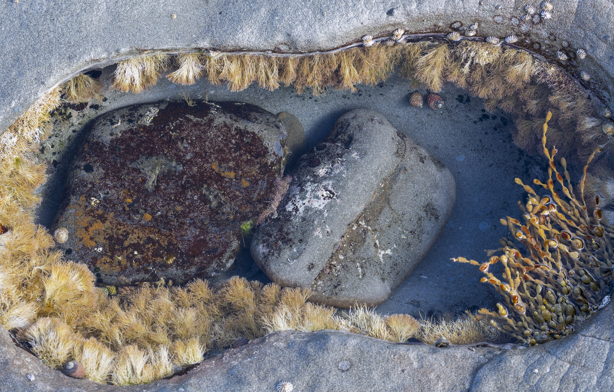 The pools are abundantly decorated with yellow beads of Neptune’s Necklace seaweed and bright red anemone flowers. Anemones are not seaweed, but their tentacles sway in the water like flower petals. Little crabs scuttle across the bottom, so fast that I couldn’t capture any in photos. Sitting next to such a pool filled with crystal-clear ocean water, you can spend a long time watching the adventures of various mollusks and crabs. I thought it would be nice to make a video of it.